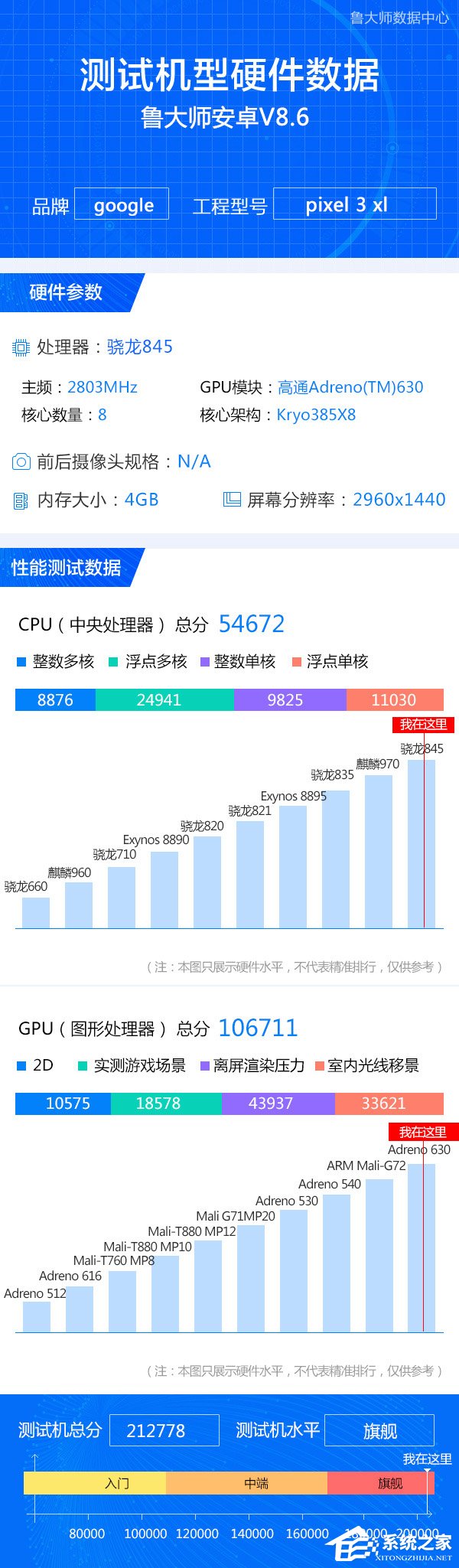 从鲁大师上的跑分数据来看,Pixel 3 XL预装搭载了骁龙845处理器,屏幕分辨率为2960x1440分辨率,CPU(中央处理器)总分54672,GPU(图形处理器)总分106711,测试机总分212778。